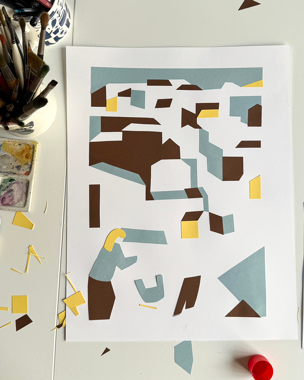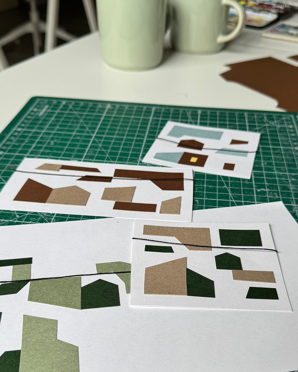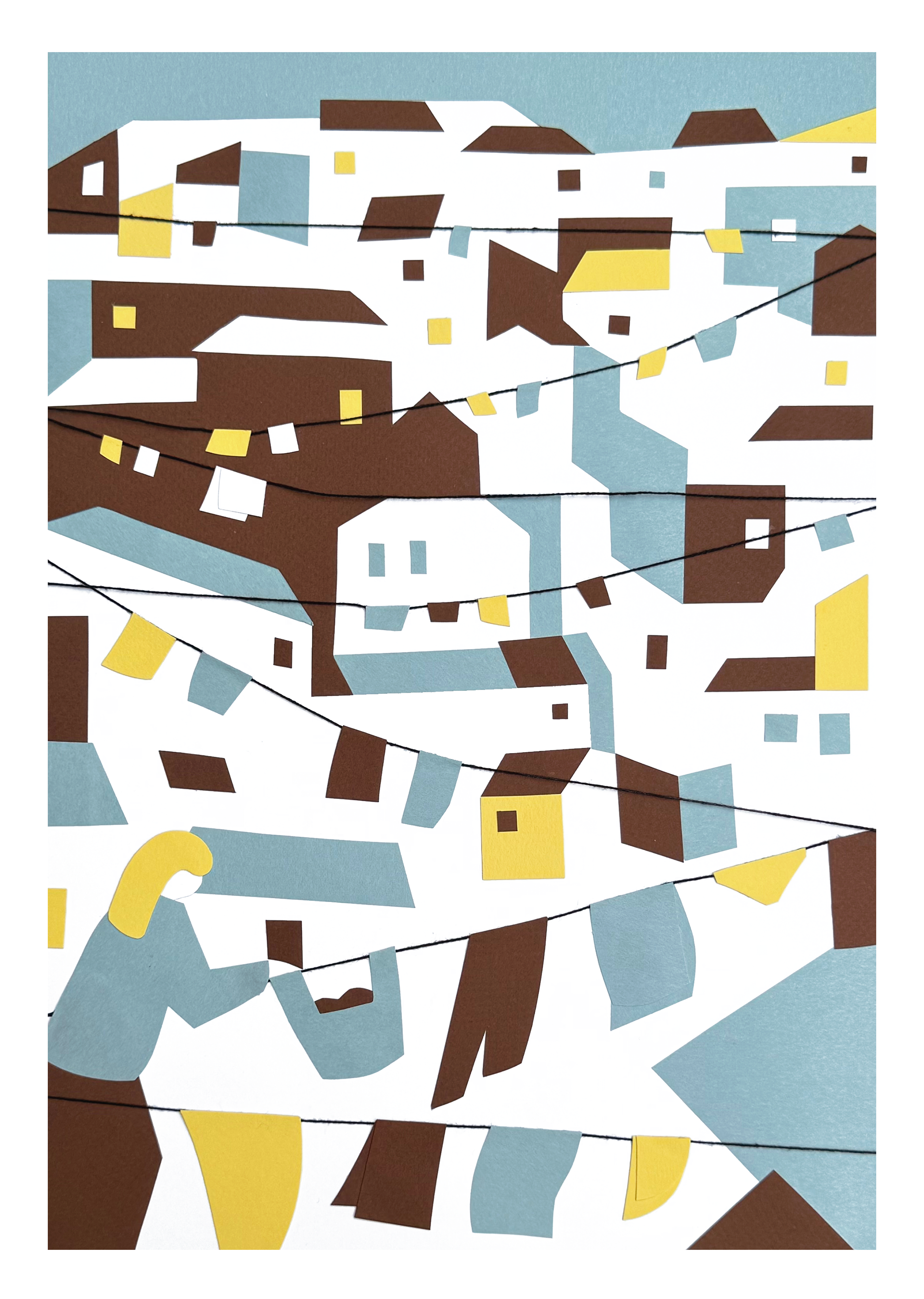 The illustration was handmade, built in layers with colored card and cotton thread. I imagined a line of laundry connecting different houses, stretching from afar and finally reaching a woman who gathers it with care. This simple act of hanging laundry becomes a way to unite homes and transform them into an attentive and caring community.