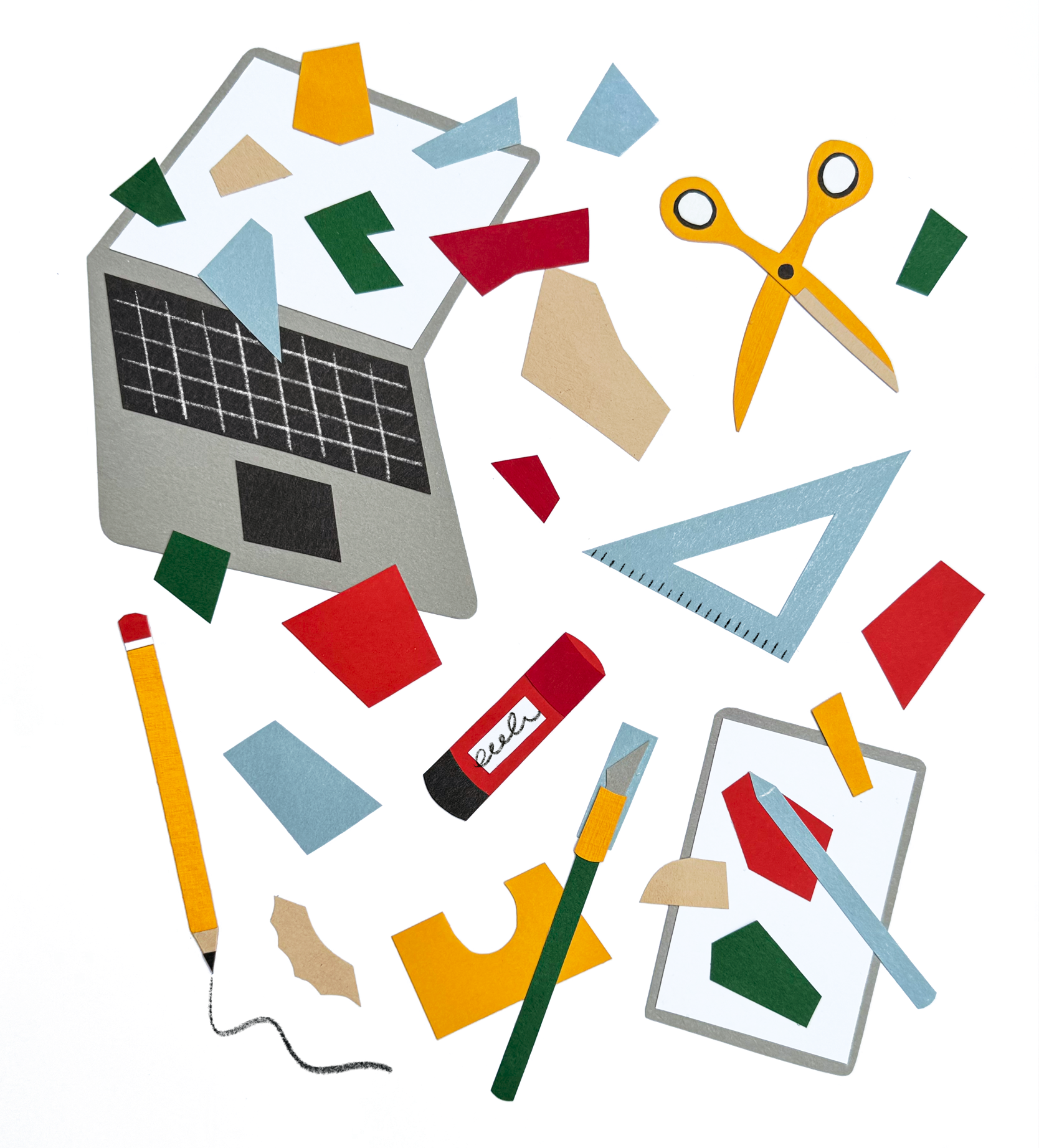 I often work with analog collage, using paper and color to build layered, handmade compositions. Alongside this, I also create digital illustrations using Procreate, Photoshop, and Illustrator, often mixing analog and digital techniques depending on the project.