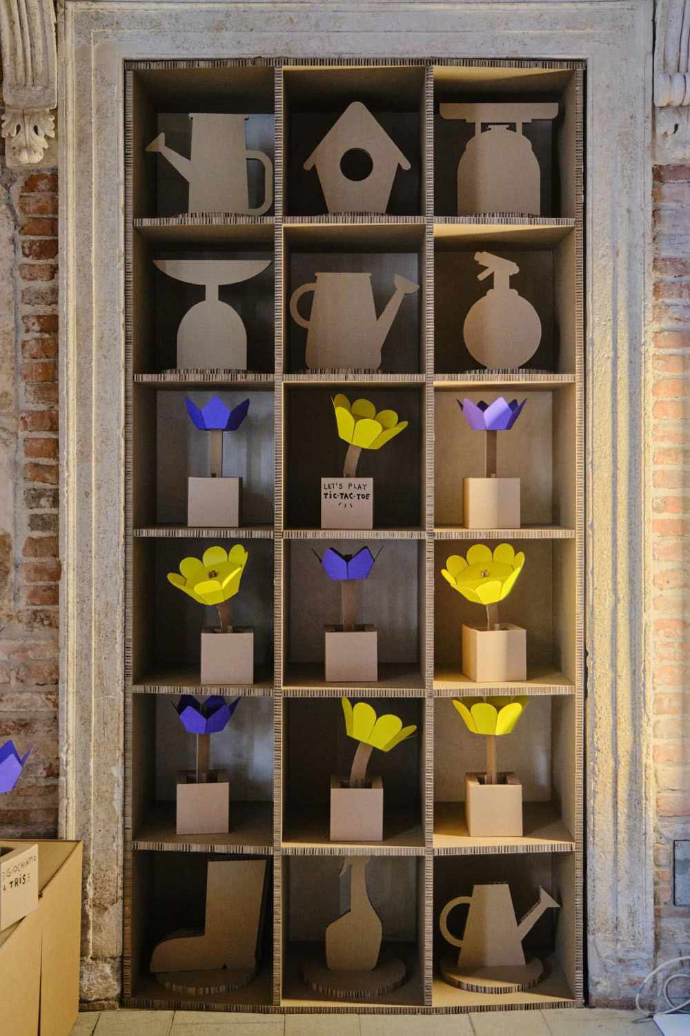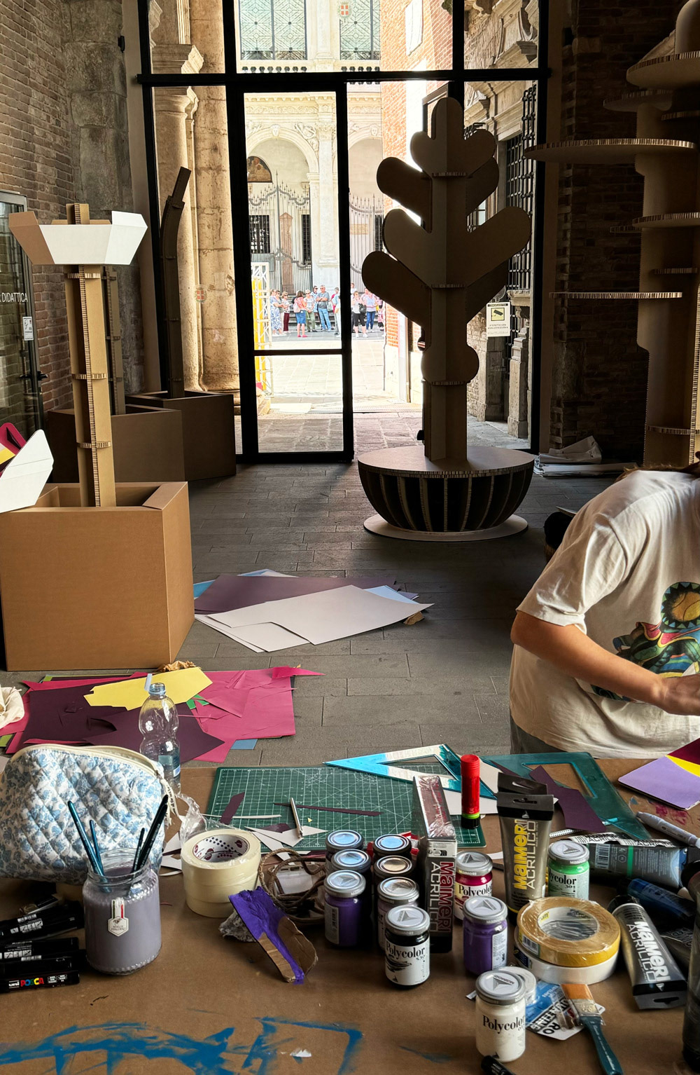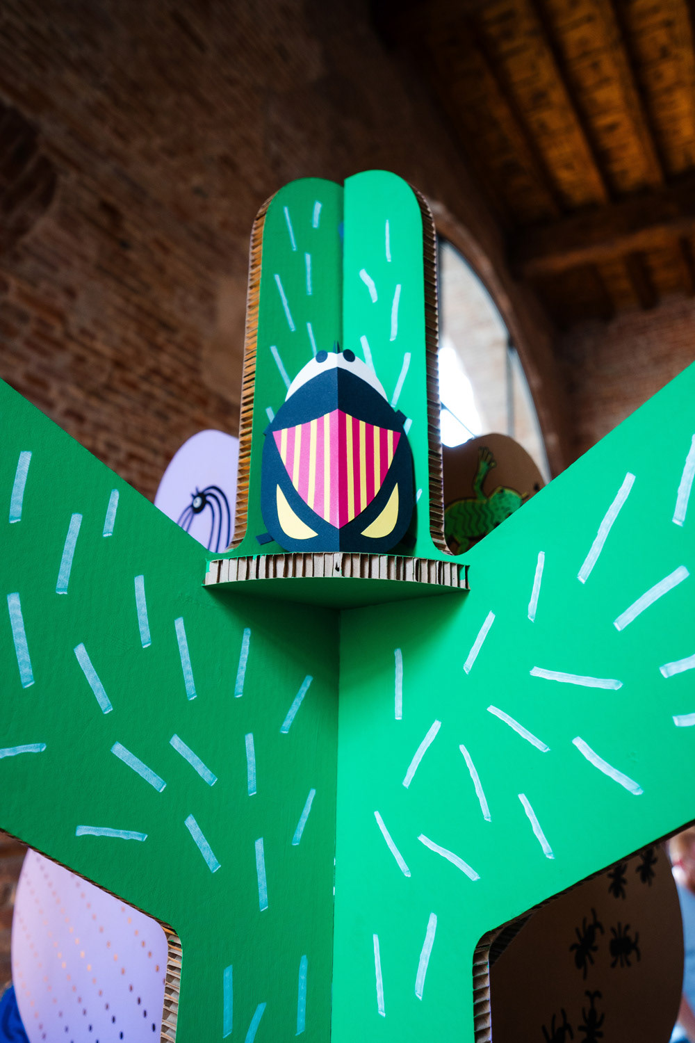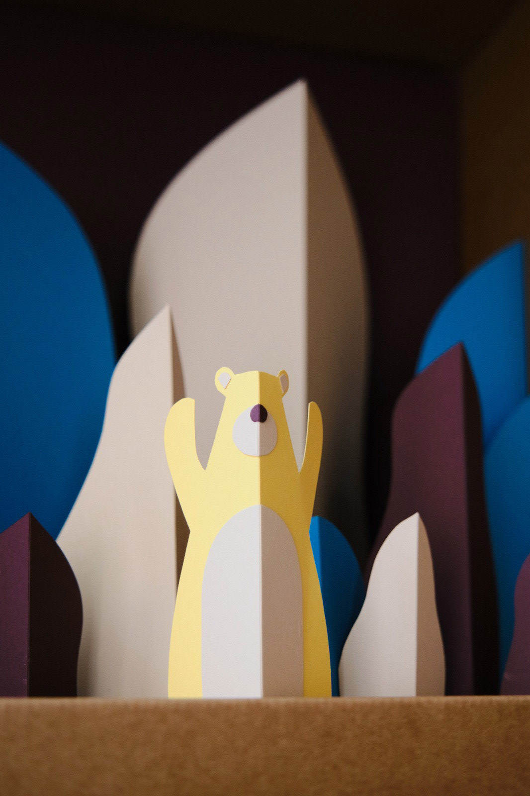 I worked alongside Lorenzo Duina, Lucrezia Viperina, Margherita Caspani, and Silvia Reginato. Each of us worked in our preferred techniques, but we had fun collaborating while maintaining a cohesive style and coordinated color palette. I focused primarily on paper, creating layered landscapes and small animals that inhabit the space!