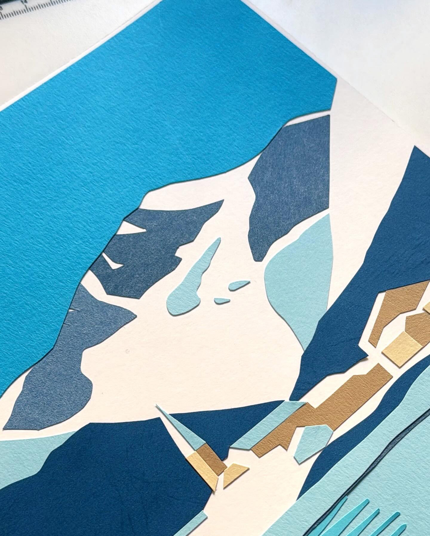 The illustration is created using collage, combining the solids and voids of snow to shape the landscape.